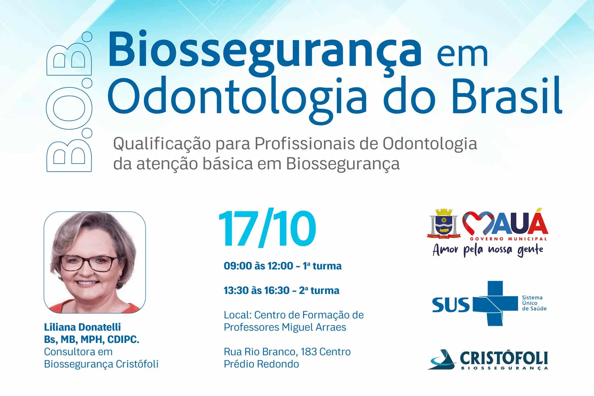 É com muita alegria que compartilho com vocês uma iniciativa especial do BOB – Biossegurança em Odontologia para o Brasil, um programa da Cristófoli Equipamentos de Biossegurança que leva as melhores práticas de biossegurança para diversas regiões do país. Desta vez, a cidade de Mauá é a privilegiada com o evento “Qualificação em Biossegurança para Profissionais da Odontologia da Atenção Básica”, que acontecerá no dia 17 de outubro, com duas opções de horário, em uma ação realizada em parceria com a Prefeitura de Mauá.
